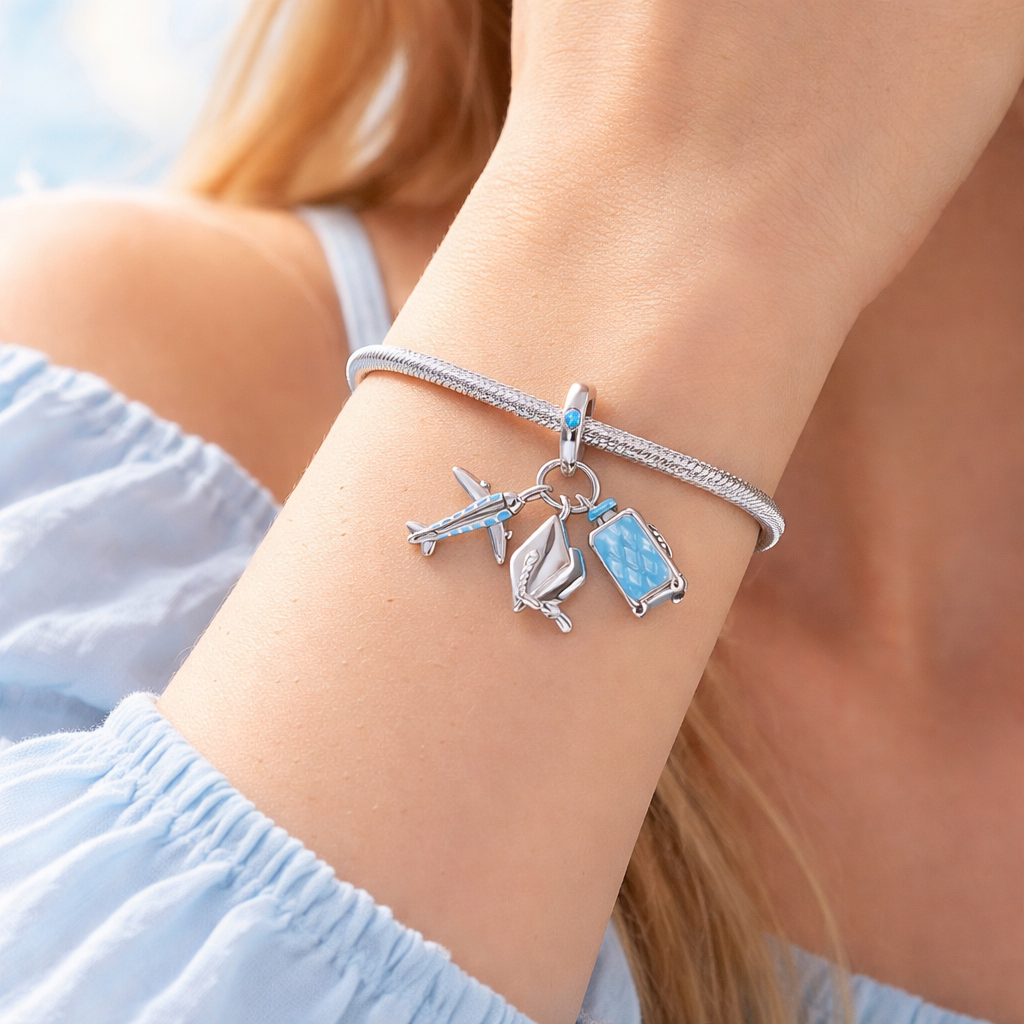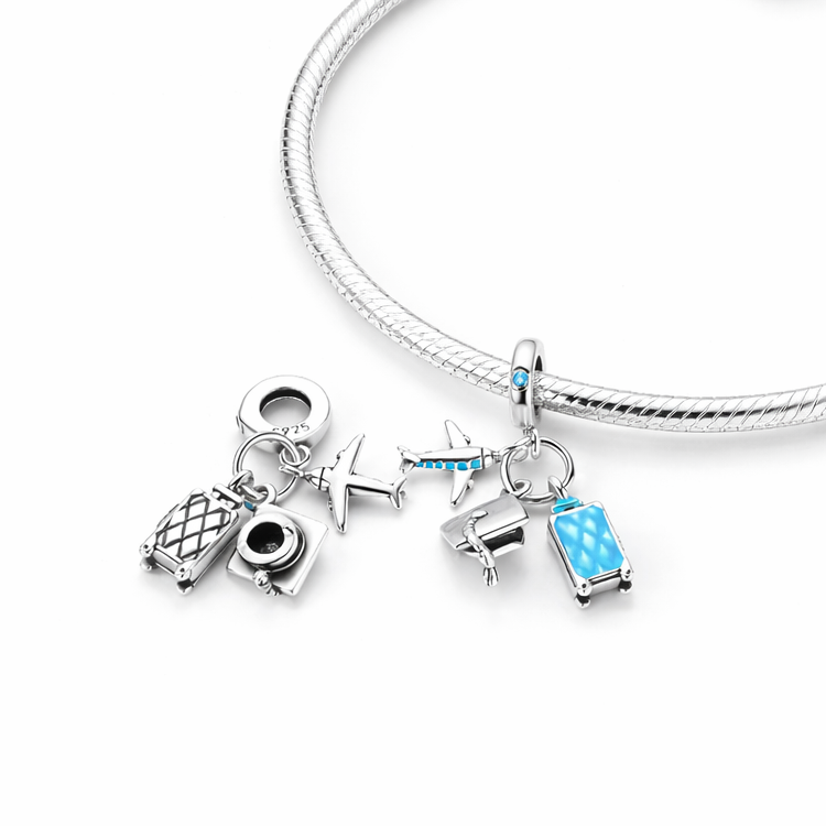 MariaFonte Charm Cappello Laurea Aereo e Valigia Trolley Argento Compatibile con Collane e Bracciali Pandora